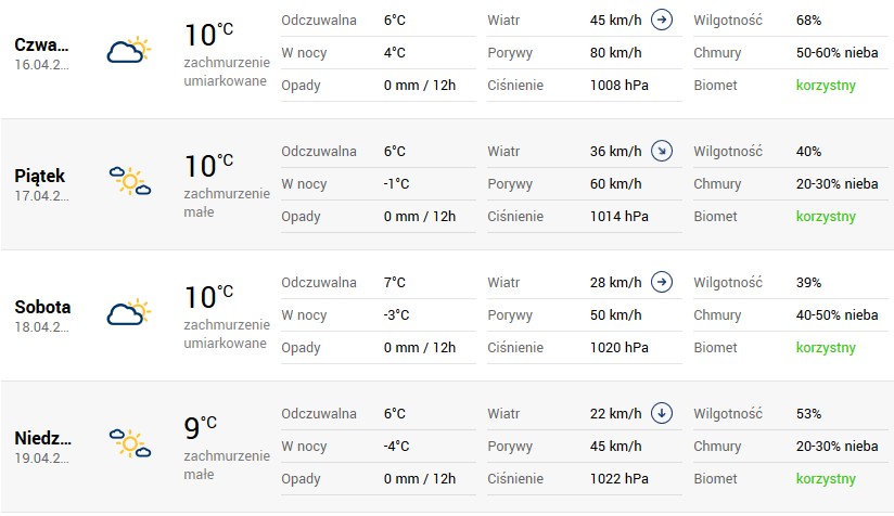 Dziś i w najbliższe dni będzie nam dokuczać porywisty wiatr w porywach około 80 km/h. Zachmurzenie umiarkowane z odczuwalną temperaturą 6 stopni Celsiusza.