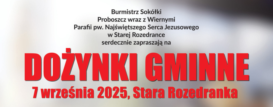 W niedzielę 7 września 2025 roku w Starej Rozedrance odbędą się Dożynki Gminne, do wzięcia udziału w których serdecznie zapraszają Burmistrz Sokółki oraz Proboszcz wraz z Wiernymi Parafii pw. Najświętszego Serca Jezusowego w Starej Rozedrance.