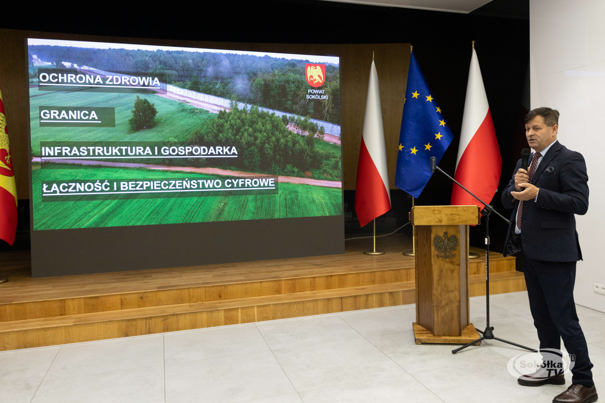 Wicestarosta zaznaczył, że trzy przedstawione obszary – ochrona zdrowia, granica oraz infrastruktura – są kluczowe dla bezpieczeństwa i rozwoju regionu. Wskazał również na czwarty, równie istotny aspekt, który omówił Jerzy Białomyzy, członek Zarządu Powiatu Sokólskiego.