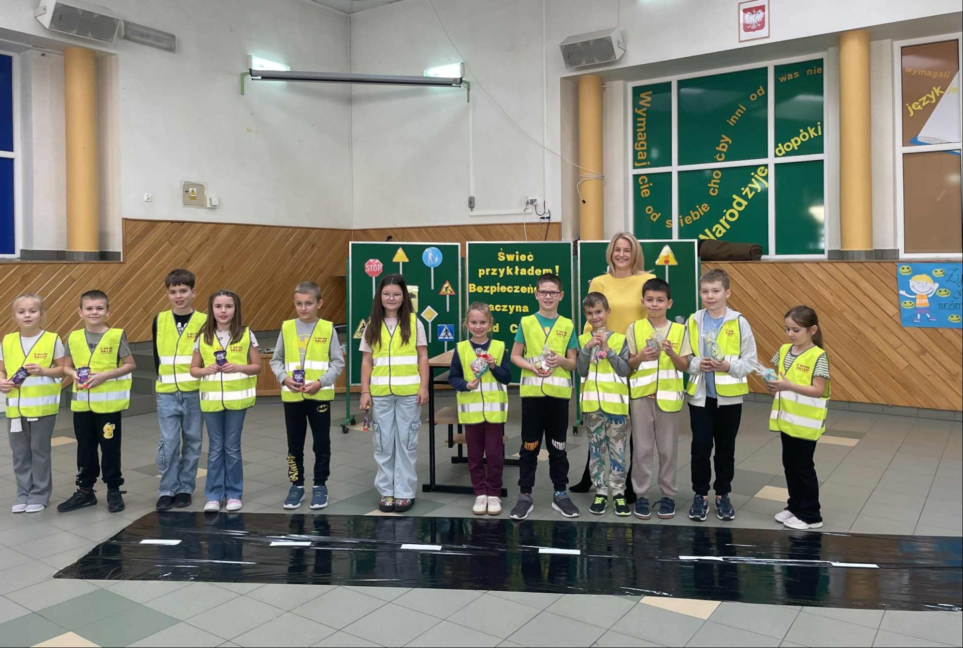 Od 23 września w szkolnym holu można oglądać wyjątkową dekorację – postacie ubrane w kamizelki odblaskowe. Wystawę uzupełniają gazetki świetlicowe z informacjami o znakach drogowych, sygnałach świetlnych i zasadach poruszania się po ulicy.