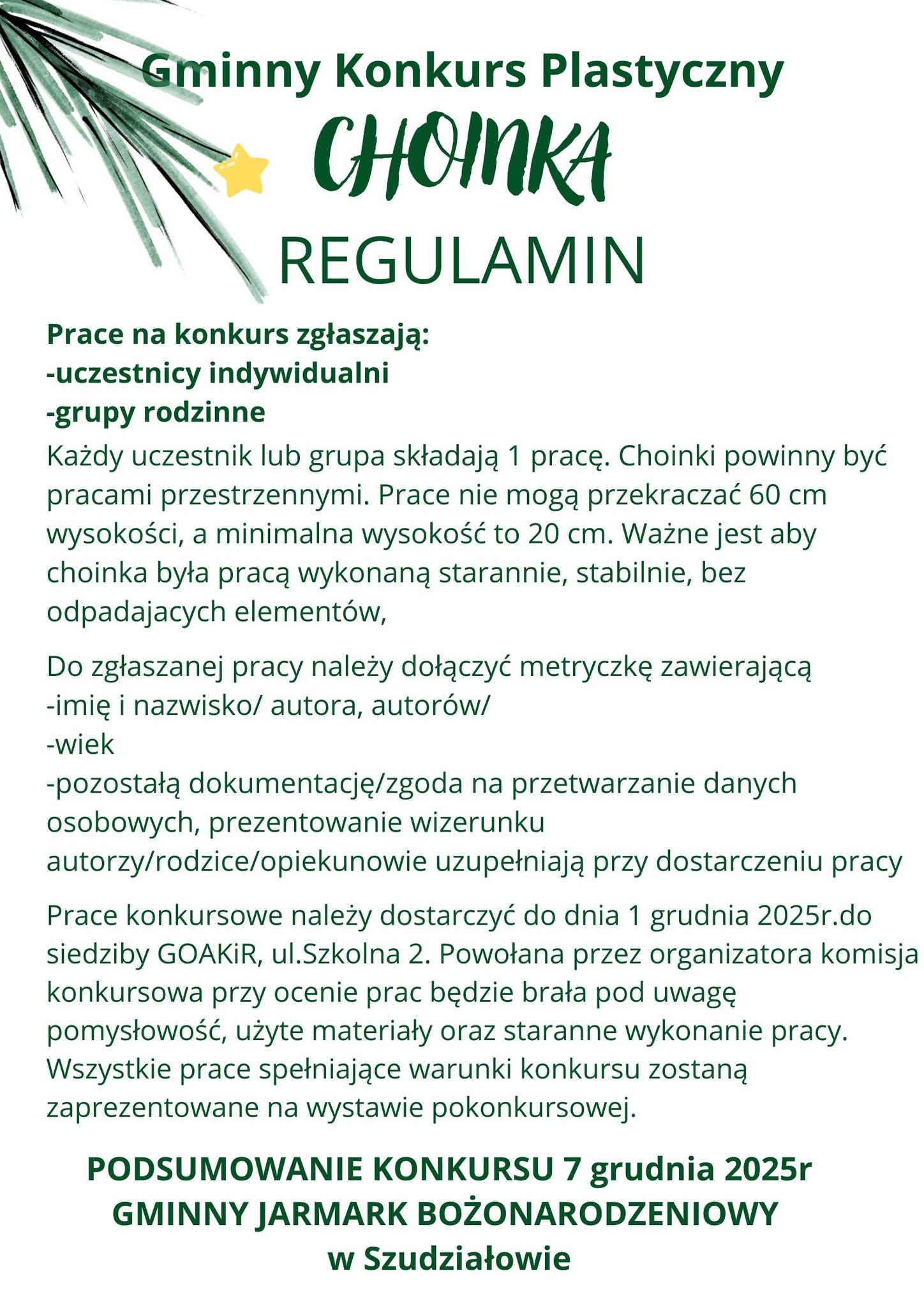 Każdy uczestnik lub grupa może zgłosić jedną pracę przestrzenną – choinkę wykonaną w dowolnej technice. Prace powinny być stabilne, starannie wykonane i pozbawione odpadających elementów. Wysokość choinki nie może przekraczać 60 cm, a minimalna wysokość wynosi 20 cm.