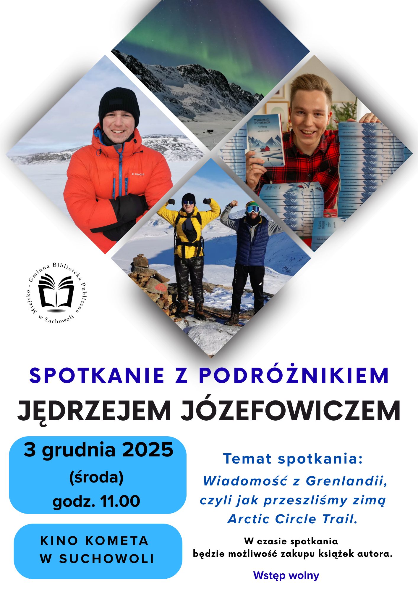 Już 3 grudnia 2025 r. o godzinie 11.00 w kinie KOMETA w Suchowoli odbędzie się spotkanie autorskie z podróżnikiem Jędrzejem Józefowiczem. Autor opowie o zimowym przejściu Arctic Circle Trail na Grenlandii – ponad 400 km po tundrze, zamarzniętych jeziorach i w ekstremalnych warunkach.