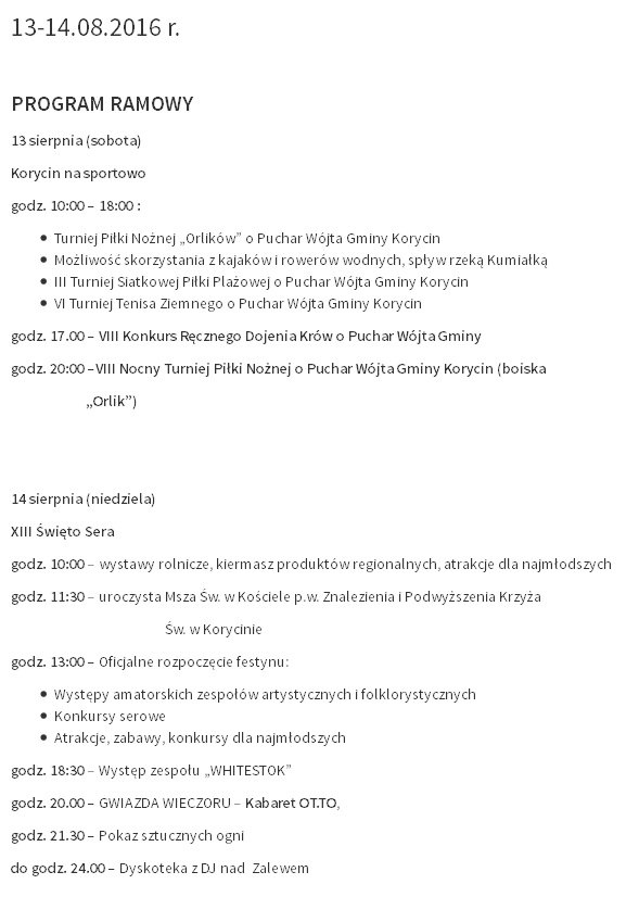 Dni Korycina i Święto Sera zaplanowano na 13-14 sierpnia 2016 roku, nad zalewem w Korycinie. Pierwszy sobotni dzień to: „Korycin na sportowo” z całą gamą różnorodnych turniejów sportowych o Puchar Wójta Gminy Korycin, a także VIII Konkurs Ręcznego Dojenia Krów, który odbędzie się o godz. 17:00.