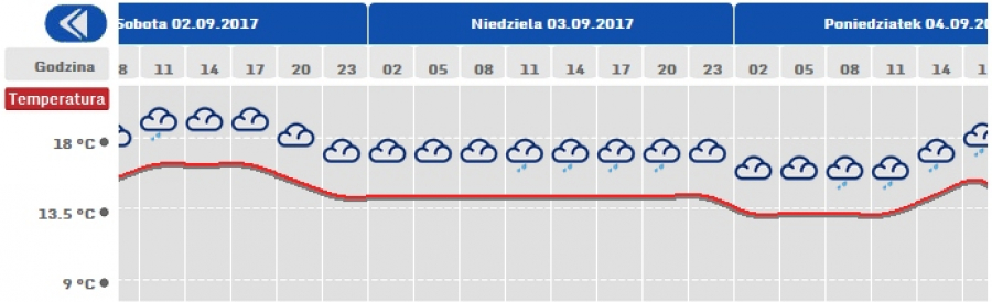 W ciągu dnia zachmurzenie całkowite z okresowymi opady deszczu. Temperatura maksymalna od 14°C do 15°C. W nocy zachmurzenie duże. Okresami opady deszczu. Miejscami mgła ograniczająca widzialność do 200 m. Temperatura minimalna od 10°C do 11°C.