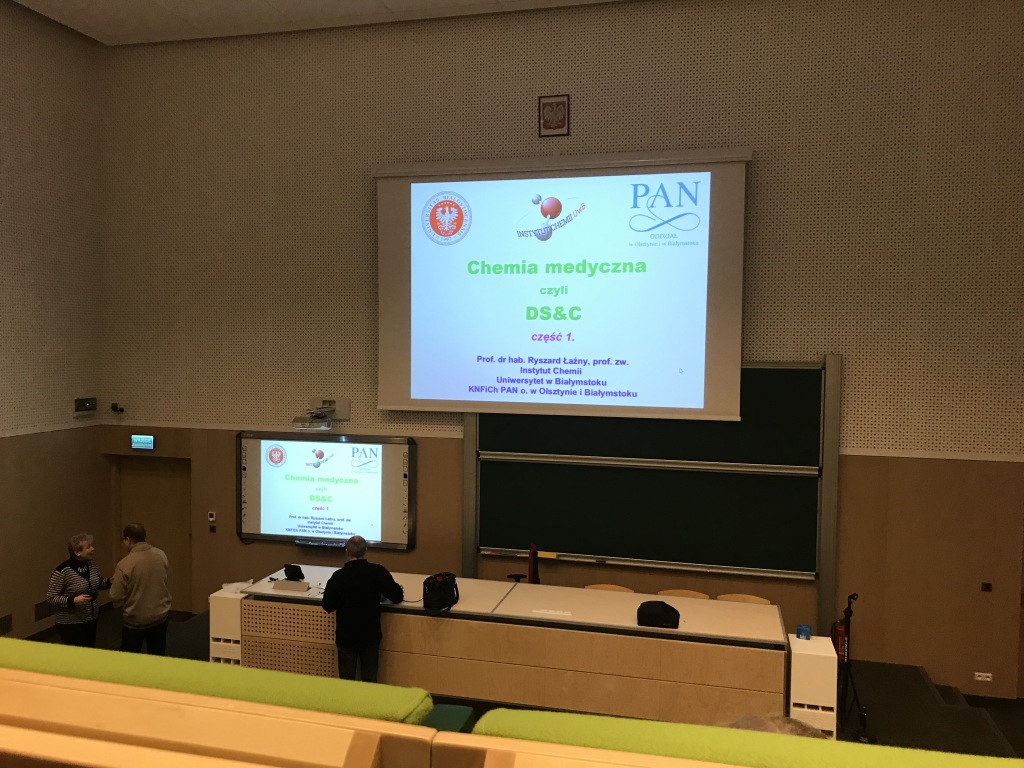 Wysłuchanie wykładu : „Chemia medyczna, czyli DS&C” prowadzonego przez prof. dr hab. Ryszarda Łaźnego, prof. zw. Instytutu Chemii Uniwersytetu w Białymstoku oraz KNFiCh PAN o. w Olsztynie i Białymstoku. Był to pierwszy cyklu wykładów wprowadzający w zagadnienia związane z dziedziną nauki jaka jest: chemia medyczna. Zwiedzanie nowoczesnych pracowni laboratoryjnych w Instytucie Chemii i zapoznanie się z najnowszą ofertą edukacyjną na przyszły rok. Organizator wycieczki: Krystyna Grzesik – nauczyciel chemii w LO w Sokółce.