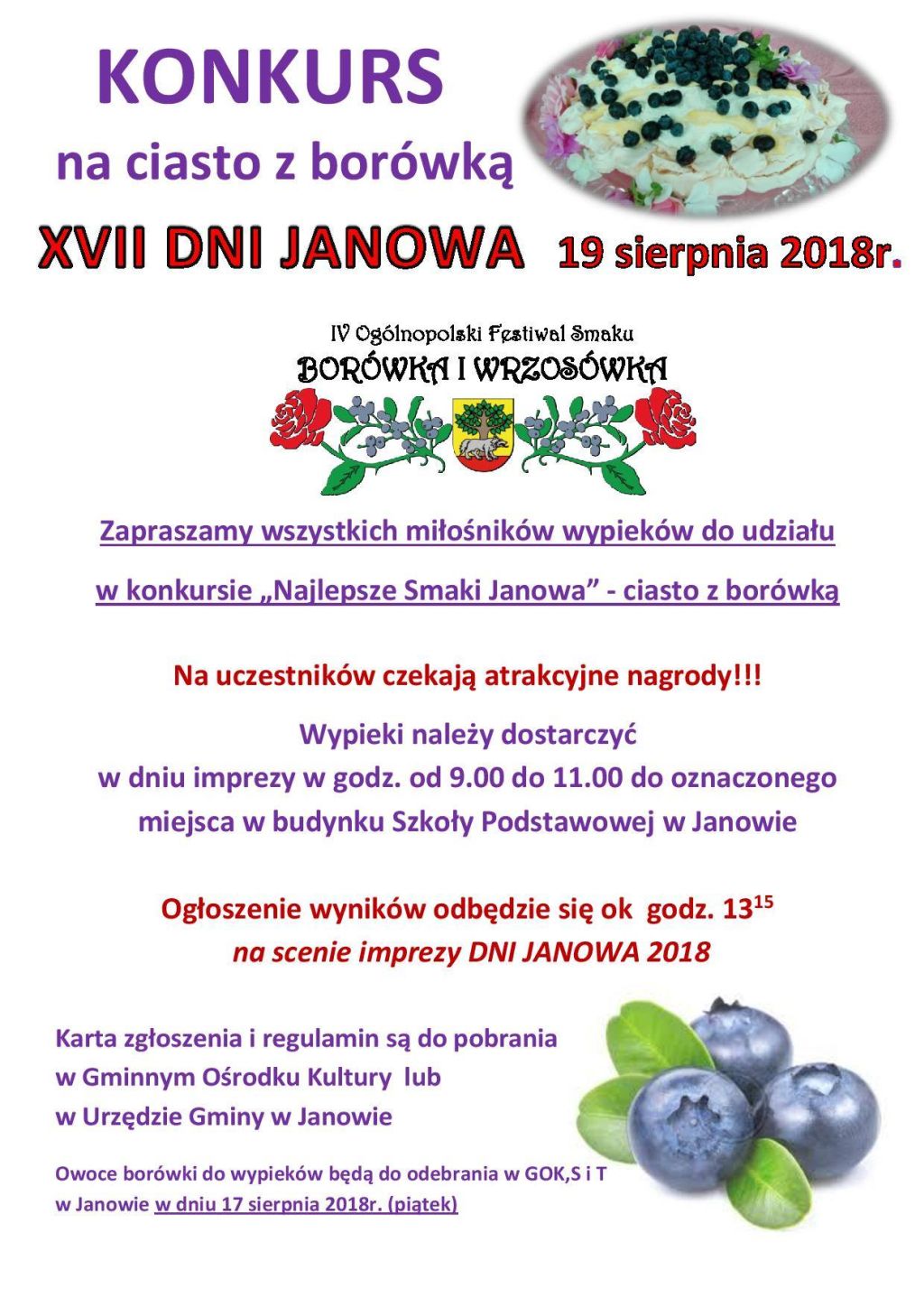 Organizatorzy Dni Janowa zapraszają wszystkich miłośników wypieków do udziału w konkursie "Najlepsze Smaki Janowa" - ciasto z borówką.