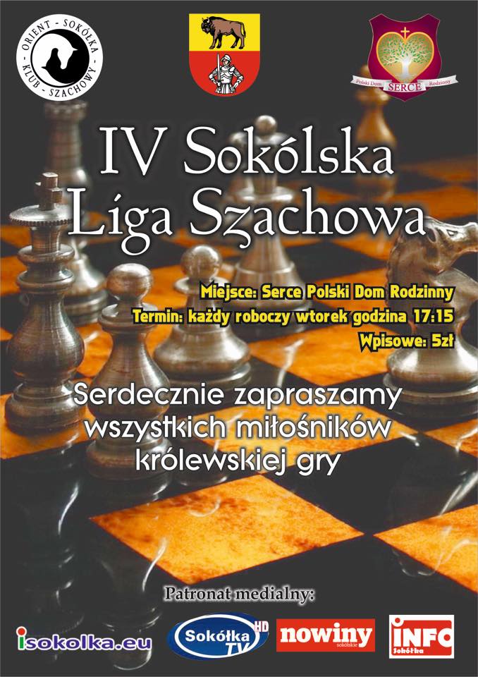 Zapraszamy serdecznie już dziś, wszystkich miłośników gry w szachy na I rundę IV edycji Sokólskiej Ligi Szachowej. Rozgrywki rozpoczną się o godz. 17:15 w Polskim Domu Rodzinnym "Serce".