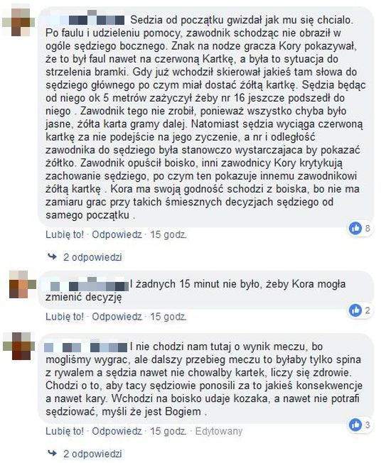 Jak informuje jeden z zawodników Kory: "Zeszliśmy z obawą o nasze zdrowie, bo po takim groźnym faulu, po którym zeszliśmy z boiska, sędzia nie dał nawet upomnienia zawodnikowi Pomorzanki, a kto wie jak gra wyglądałaby dalej?"