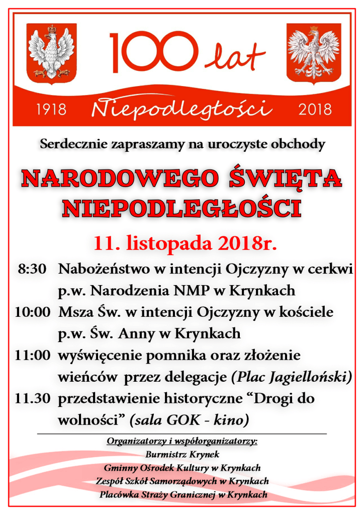 O godz. 8:30 odbędzie się Nabożeństwo w intencji Ojczyzny w cerkwi pw. Narodzenia NMP w Krynkach, a o godz. 10:00 wierni pomodlą się na Mszy Św. w kościele p.w. Św. Anny w Krynkach. Następnie o godz. 11:00 będzie wyświęcenie pomnika oraz złożenie wieńców przez delegację na Placu Jagiellońskim. Uroczystości zakończy przedstawienie historyczne pt."Drogi do wolności" w sali GOK - kino.