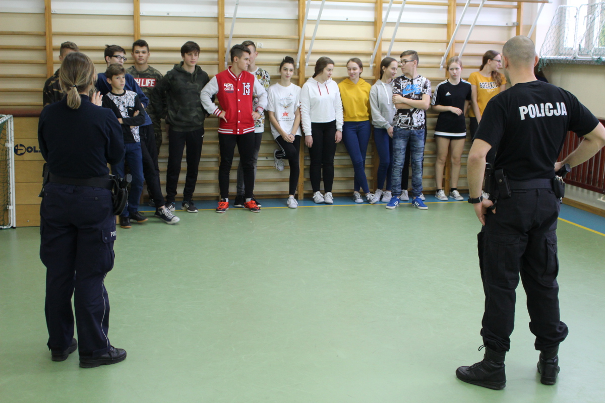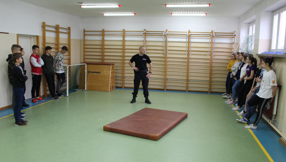 Policjanci z Komendy Powiatowej Policji w Sokółce spotkali się wczoraj z najstarszymi uczniami Szkoły Podstawowej w Kuźnicy. Spotkanie miało miejsce na sali sportowej. Mundurowi zaprezentowali młodym ludziom techniki samoobrony podczas ataku napastnika. Następnie uczniowie powtarzali ćwiczenia pod okiem Instruktora Taktyki i Technik Interwencyjnych.