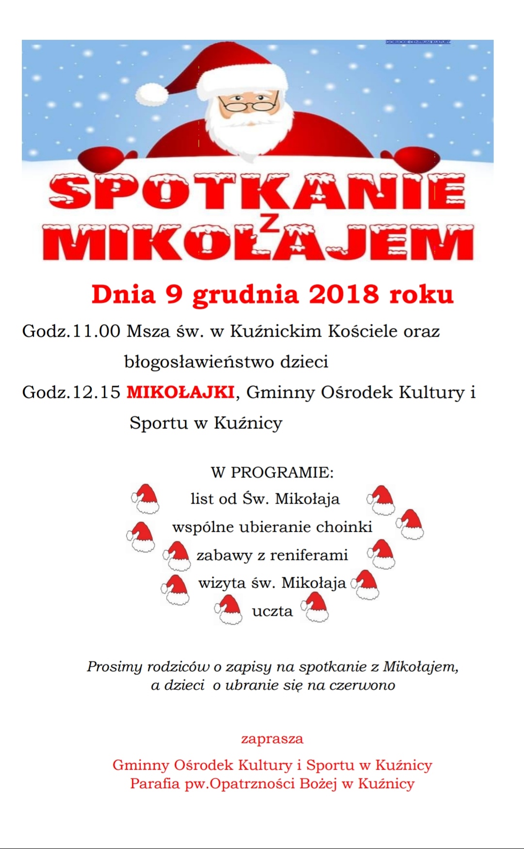 9 grudnia w Kuźnicy odbędzie się Spotkanie z Mikołajem. Całe wydarzenie rozpocznie Msza św. w Kuźnickim Kościele oraz błogosławieństwo dzieci o godz. 11:00. Następnie o godz. 12:15 w Gminnym Ośrodku Kultury i Sportu odbędą się Mikołajki.