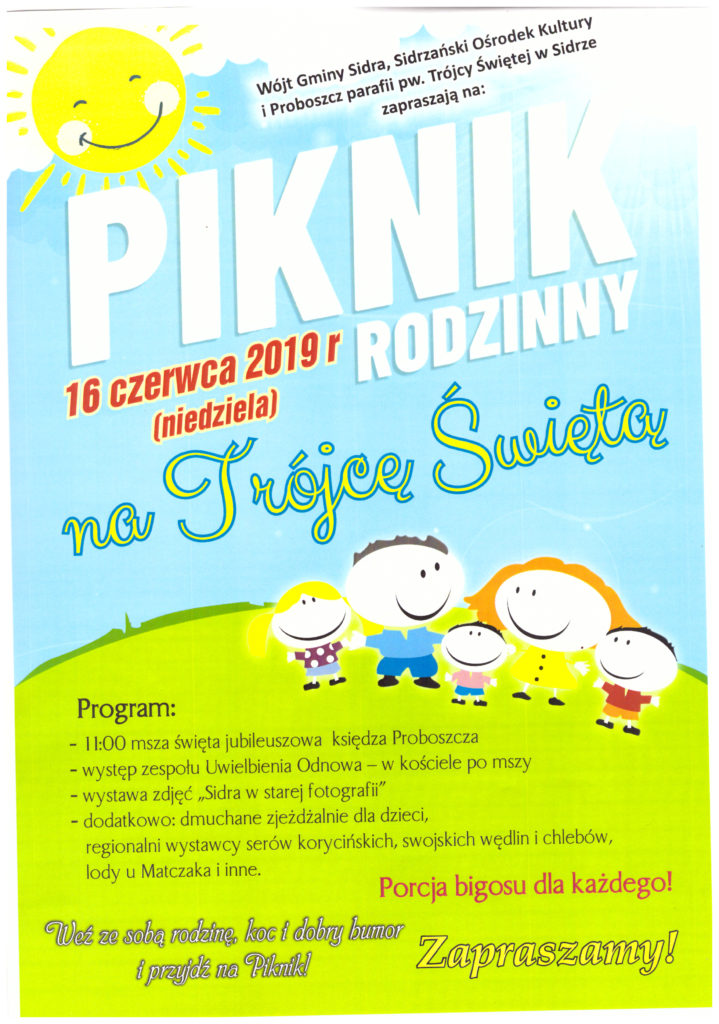 Już w tę niedzielę przy kościele pw. Trójcy Świętej w Sidrze odbędzie się piknik rodzinny.