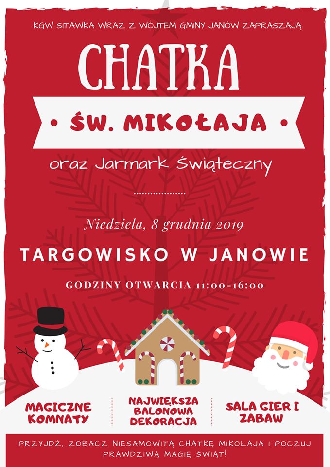 Niezwykłe wydarzenie w Janowie. CHATKA ŚWIĘTEGO MIKOŁAJA i Jarmark Świąteczny na targowisku 8 grudnia 2019. Otwarcie w godzinach od 11:00 -16:00.