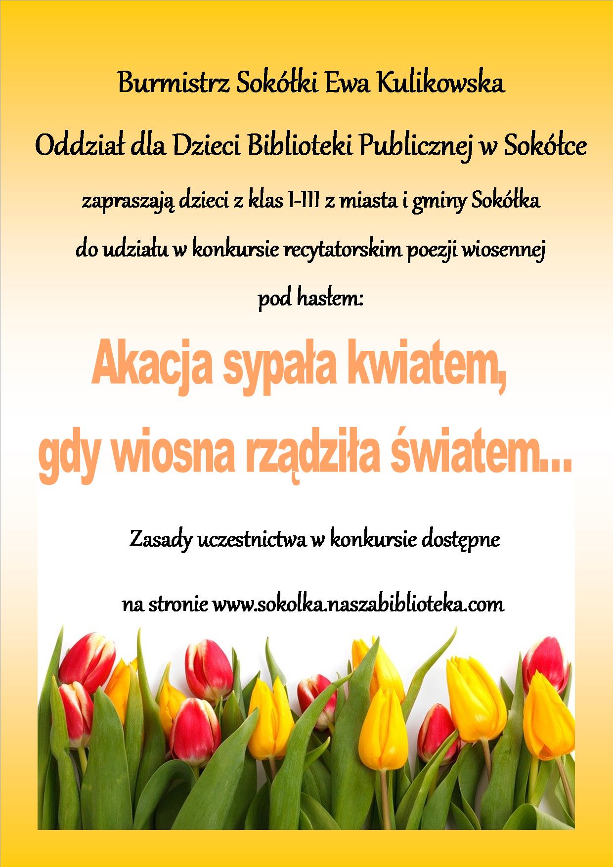 Dnia 20 marca o godz.10:00 w Bibliotece Publicznej w Sokółce odbędzie się konkurs recytatorski poezji wiosennej pod hasłem „Akacja sypała kwiatem, gdy wiosna rządziła światem".