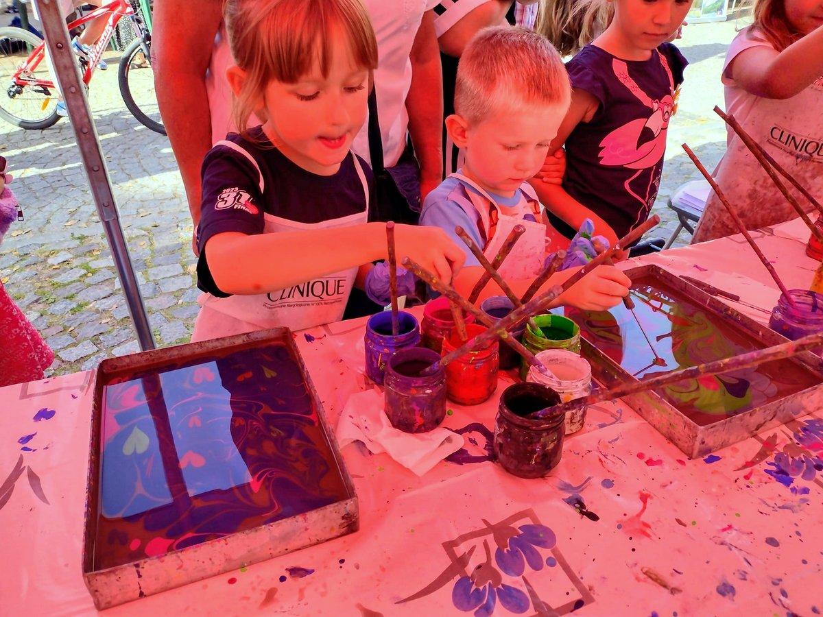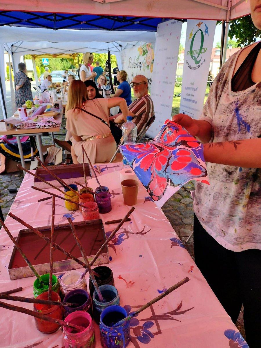 Na drugich warsztatach pani Marta Puchłowska zapoznała uczestników ze sztuką ebru. Kunszt marmurkowania Turcy seldżuccy oraz osmańscy rozpowszechnili stosując ją w kaligrafii oraz w sztuce dekorowania i oprawiania książek.