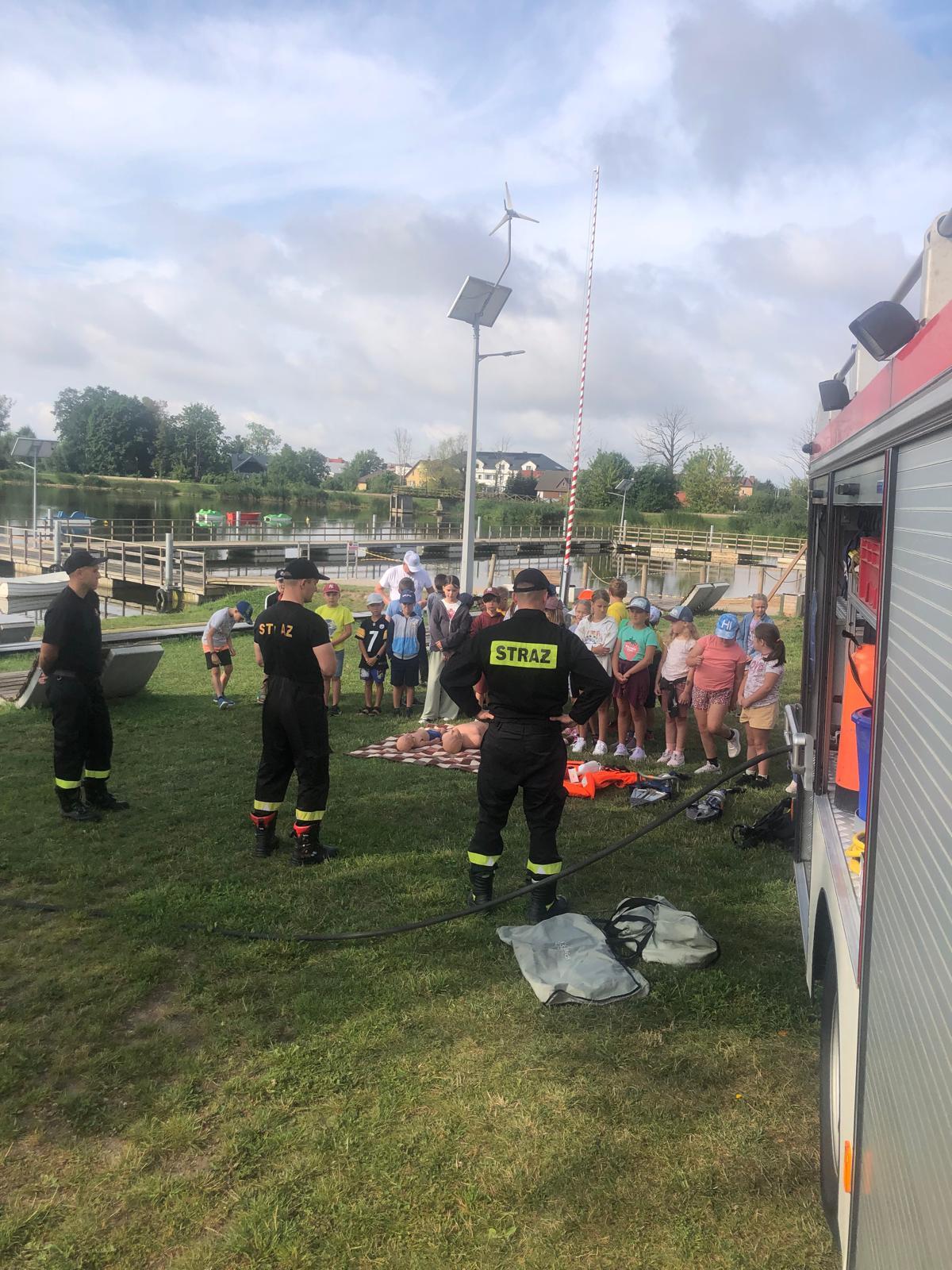 Nad zalewem wodnym w Sokółce strażacy Jednostki Ratowniczo – Gaśniczej w Sokółce przeprowadzili pogadankę, podczas której poinstruowali dzieci jak zachować się w obliczu różnego rodzaju niebezpieczeństw występujących podczas wakacji. Z uwagi na miejsce spotkania skupiono się na omówieniu sposobów bezpiecznego zachowania podczas wypoczynku nad wodą. Następnie zapoznano dzieci ze specyfiką pracy strażaka, jego rolą w systemie bezpieczeństwa oraz profilaktyką w zakresie bezpieczeństwa pożarowego w życiu codziennym, a także zaprezentowano zasady udzielania pierwszej pomocy medycznej.