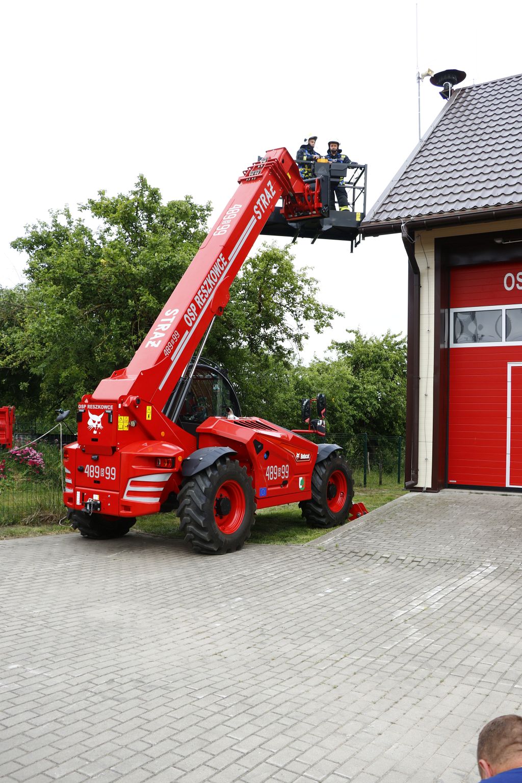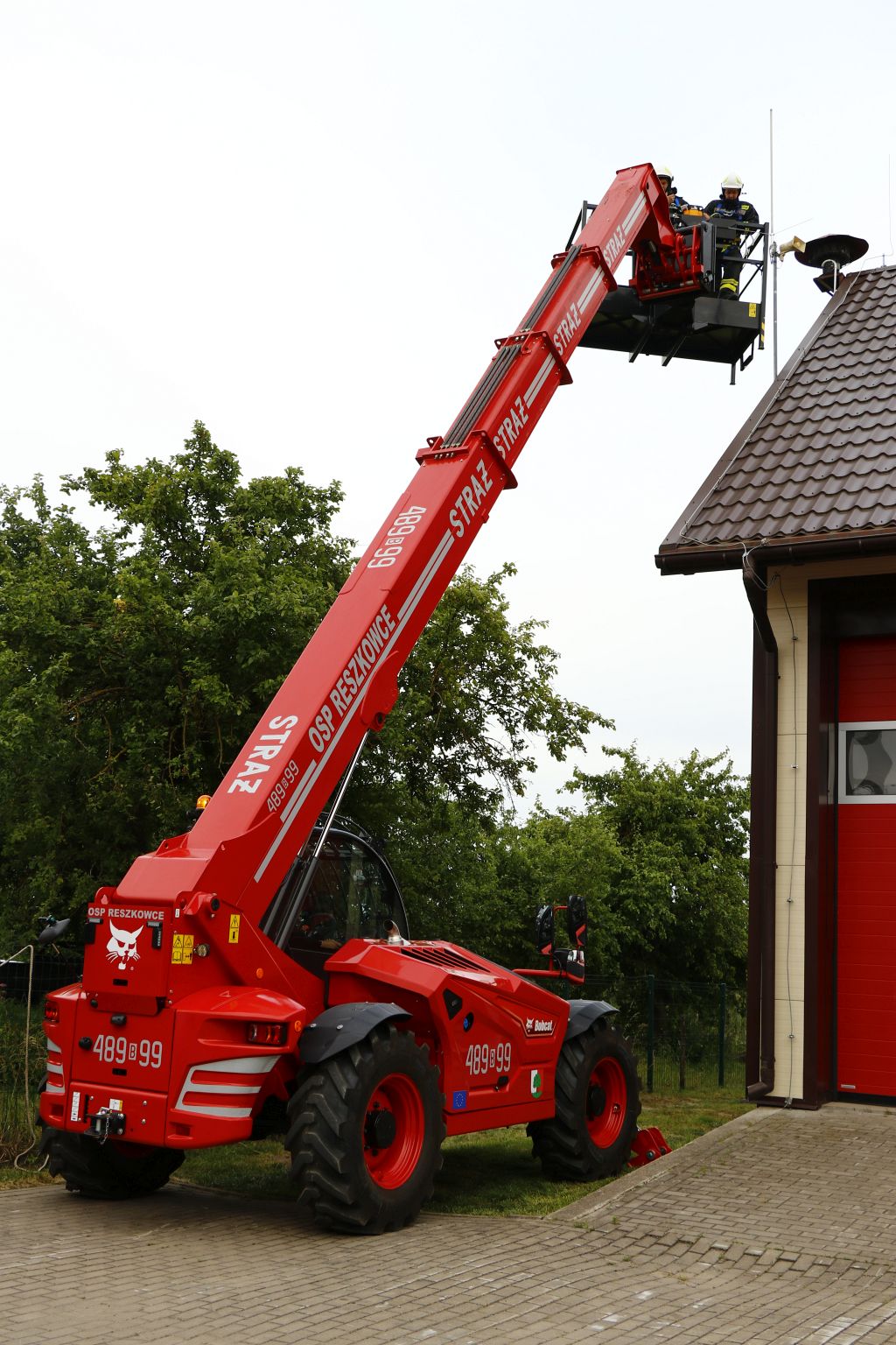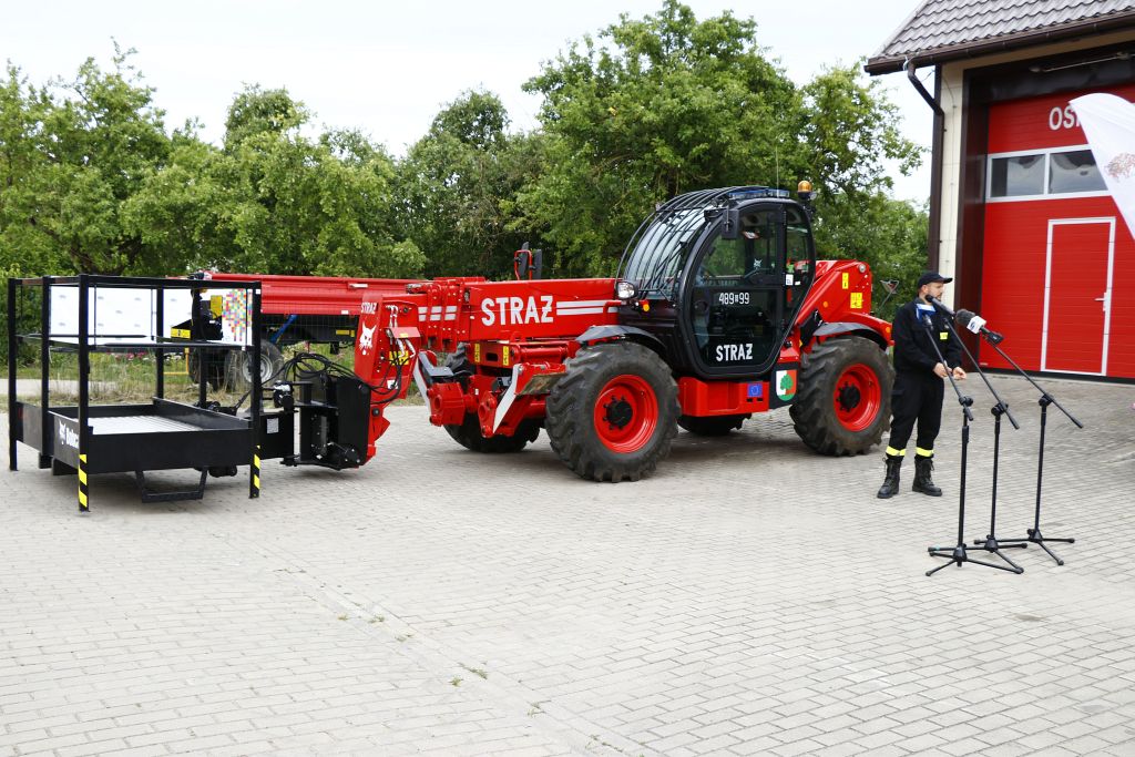 Nowa ładowarka teleskopowa posiada imponujące parametry: maksymalny wysięg wynosi 18 metrów, a udźwig – 4 tony. Maszyna została wyposażona w szereg specjalistycznych narzędzi, w tym: platformę roboczą skrętną do podnoszenia ludzi, wciągarkę, łyżkę typu „krokodyl” oraz widły paletowe. Jej zastosowanie jest bardzo szerokie, od ratowania ludzi z wysokości i gaszenia pożarów, przez usuwanie drzew i konarów powalonych podczas wichur, aż po pomoc w podnoszeniu wywróconych pojazdów czy ratowaniu zwierząt uwięzionych w studzienkach lub zbiornikach wodnych. Sprzęt sprawdzi się również przy porządkowaniu pogorzelisk oraz dotarciu do ognisk pożaru w trudno dostępnych miejscach, takich jak stogi siana czy składowiska zrębki drzewnej.
