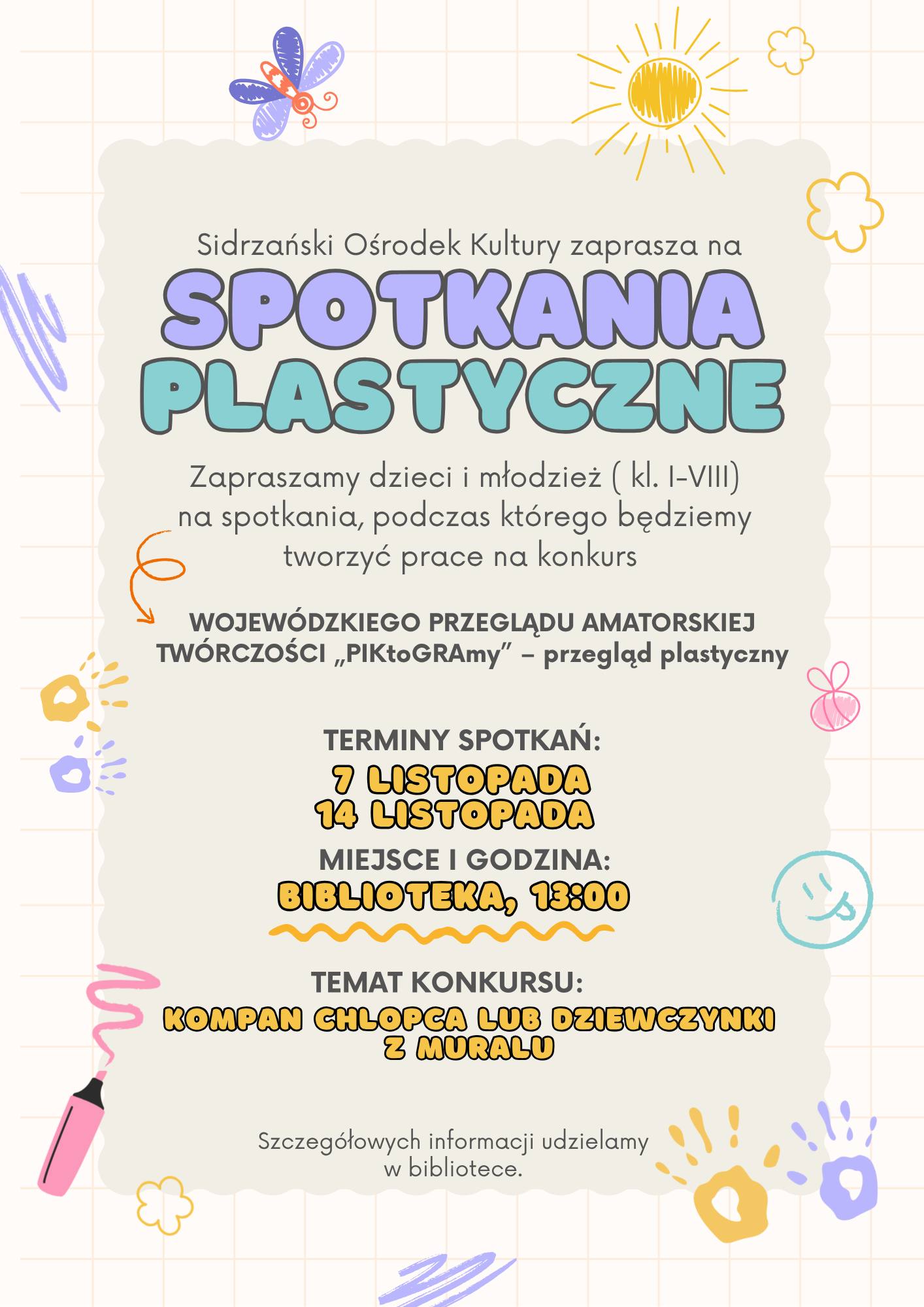 Podczas zajęć uczestnicy będą mieli okazję rozwijać swoje umiejętności plastyczne, wymieniać się pomysłami oraz tworzyć prace inspirowane własnymi zainteresowaniami i wyobraźnią.