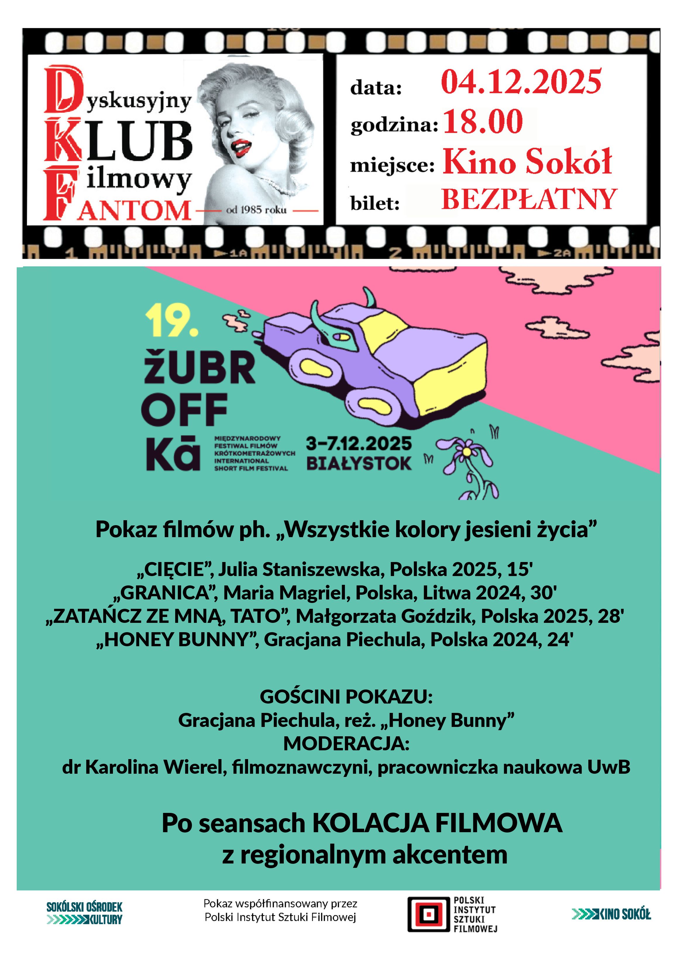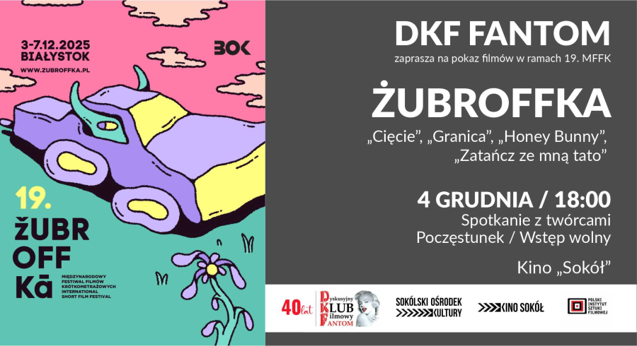 W ramach DKF Fantom zaprezentowane zostaną filmy z 19. Międzynarodowego Festiwalu Filmów Krótkometrażowych ŻUBROFFKA, który odbywać się będzie w Białymstoku i na Podlasiu 3-7 grudnia 2025 r.