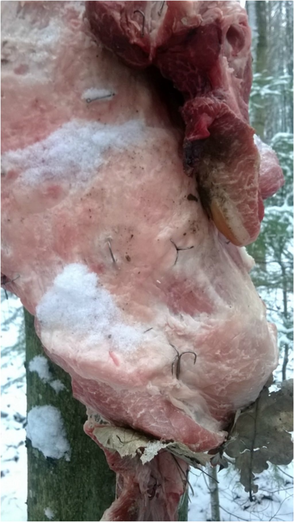 Ponacinany na całej powierzchni fragment mięsa, o długości 70 cm, był zawieszony na wysokości około dwóch metrów nad ziemią. Gdyby polujący w tej części Puszczy Knyszyńskiej wilk lub zagrożony wyginięciem ryś połasił się na świeże mięso, niechybnie spowodowałoby to jego śmierć. Bardzo bolesną i długotrwałą.