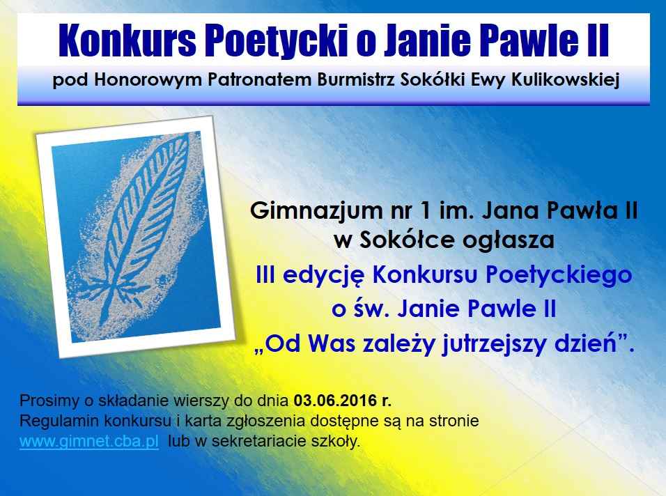 Gimnazjum Nr 1 w Sokółce rozpoczęło III edycję Konkursu Poetyckiego o św.Janie Pawle II "Od Was zależy jutrzejszy dzień". Wiersze zgłaszać można do 3 czerwca