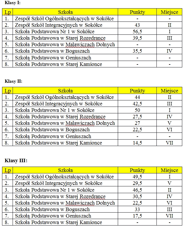 Uczestnicy otrzymali puchary, dyplomy oraz słodkie upominki od Burmistrza Sokółki, Ewy Kulikowskiej oraz Organizatora. Zawody zorganizowali i przeprowadzili nauczyciele W-F ze SP nr 1 w Sokółce.